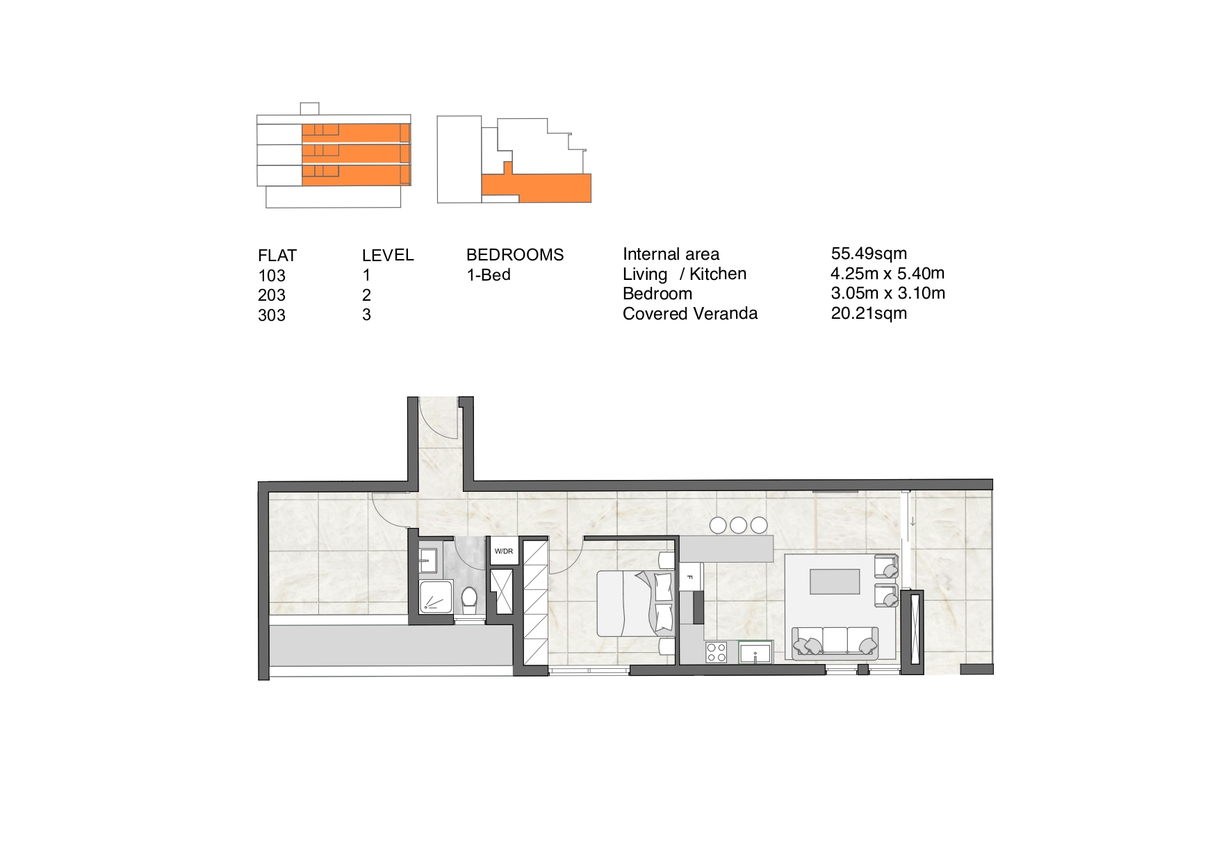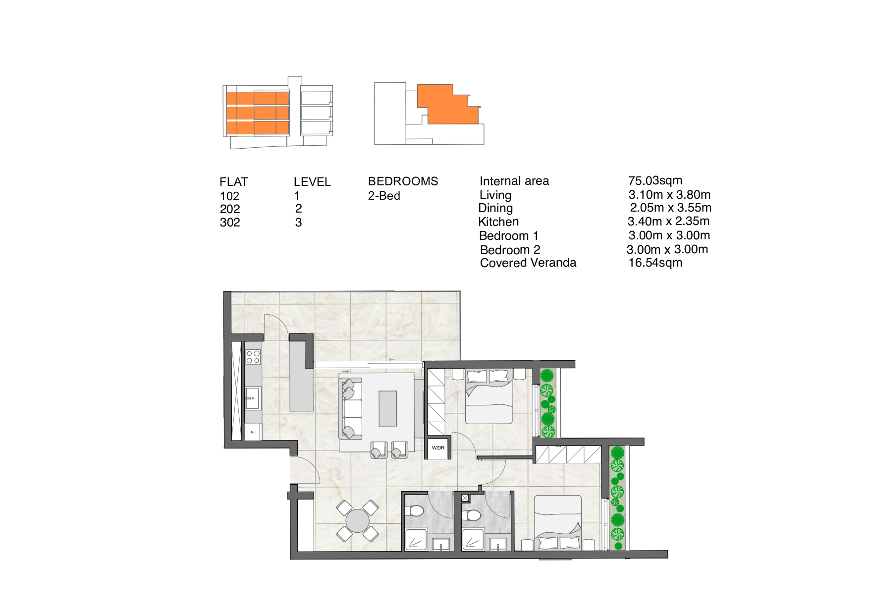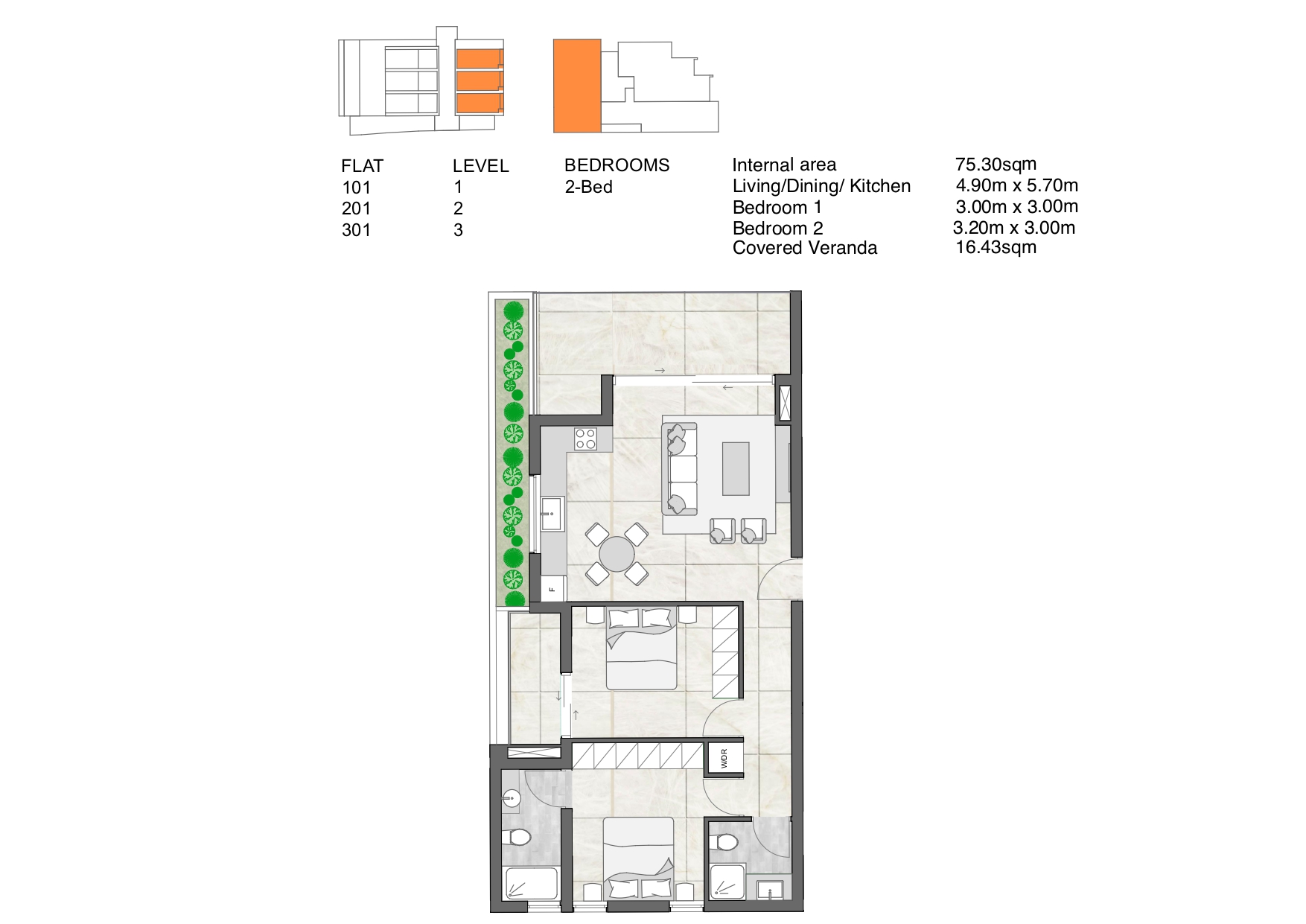 Each of the three floors in Miragaia 1 contains two double-bedroom apartments, and one single-bedroom apartment.